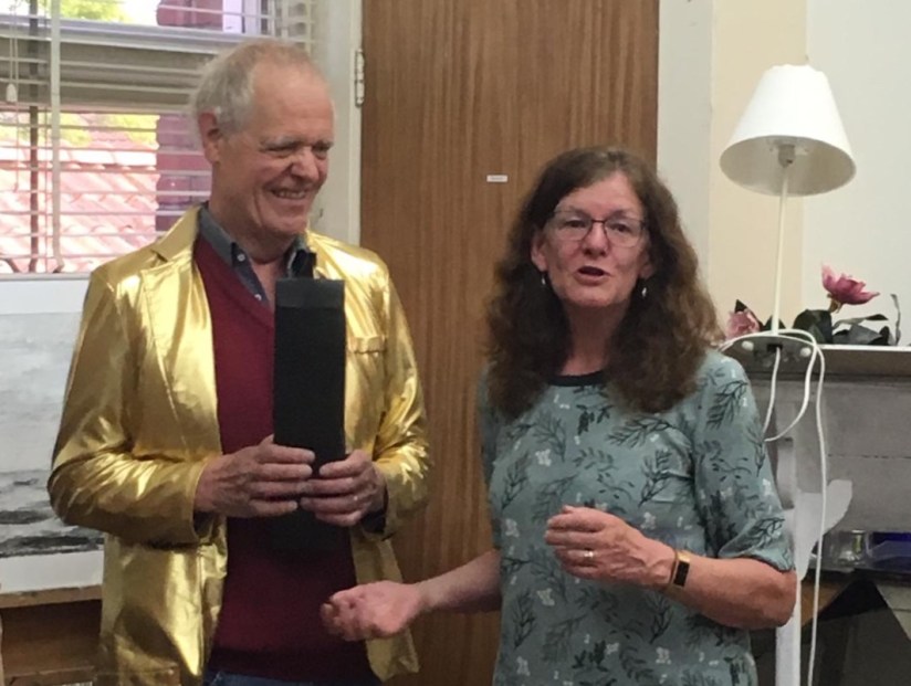 De vereniging van amateur beeldende kunstenaars, Ars et Studium kijkt terug op een zeer succesvolle en goedbezochte tentoonstelling afgelopen weekend. In het kader van de samenwerking met andere culturele organisaties in Wassenaar, was de heer Hans van Amsterdam, voorzitter van de Wassenaarse toneelvereniging MIMICRI gevraagd om de tentoonstelling te openen. En dat hebben we geweten! In plaats van een keurig woord over de kunstwerken in de tentoonstelling, werden de aanwezigen getrakteerd op een gratis openingstoneelstuk in niet minder dan drie aktes. Met het sneuvelen van een zelf meegenomen schilderij, verklaarde onze Mimicri-collega de tentoonstelling op een zeer vermakelijke (en voor de meeste leden van Ars et Studium heel onverwachtse) wijze voor geopend. Waarvoor dank. Na de officiële opening konden de aanwezigen genieten van de zeer gevarieerde werken die te zien waren en inspiratie opdoen voor het komende seizoen dat na de zomer begint. Voor meer informatie over Ars et Studium en/of om in te schrijven voor het nieuwe seizoen, ga naar www.arsetstudium.nl. Voor meer informatie over Theatergroep MIMICRI, ga naar www.mimicri.nl.